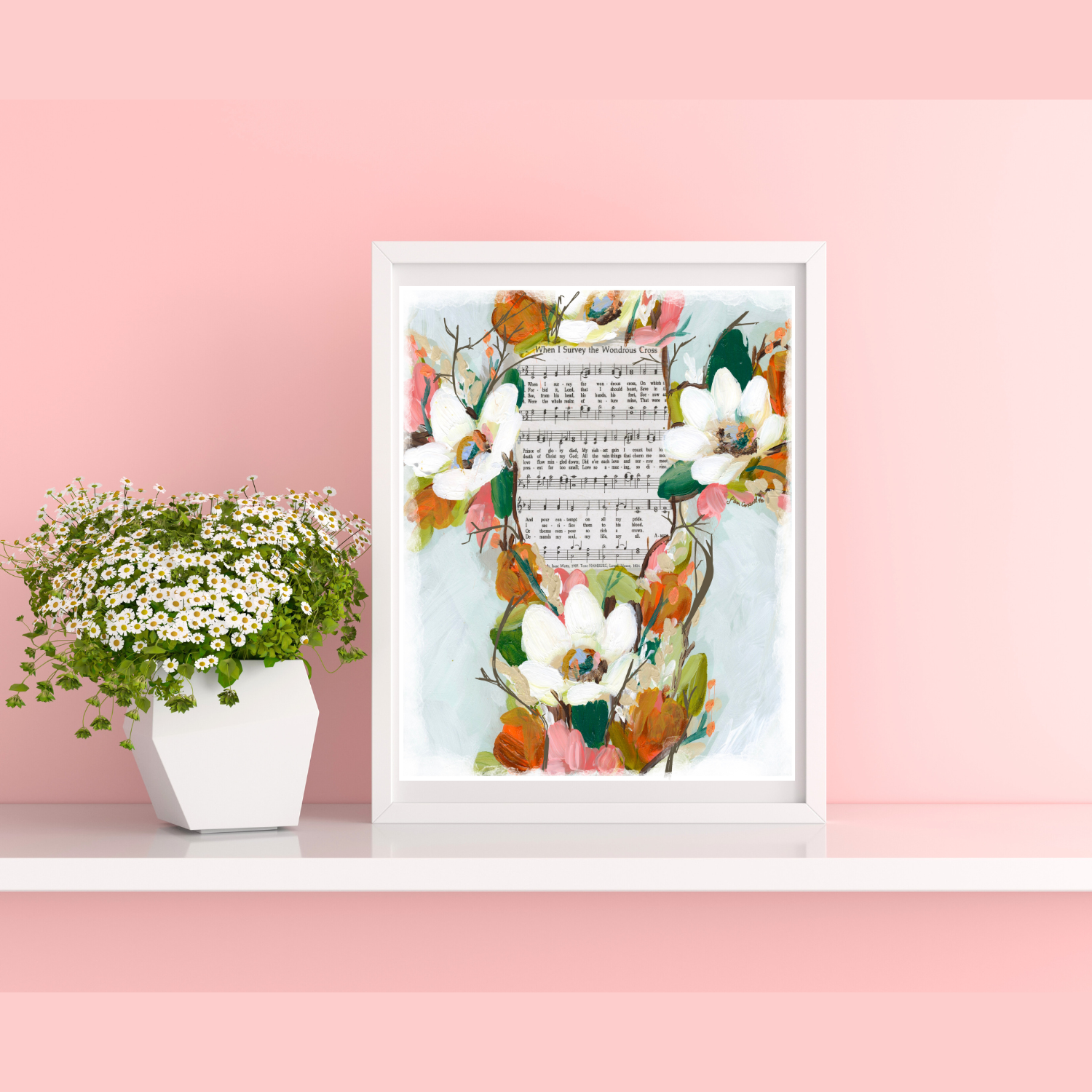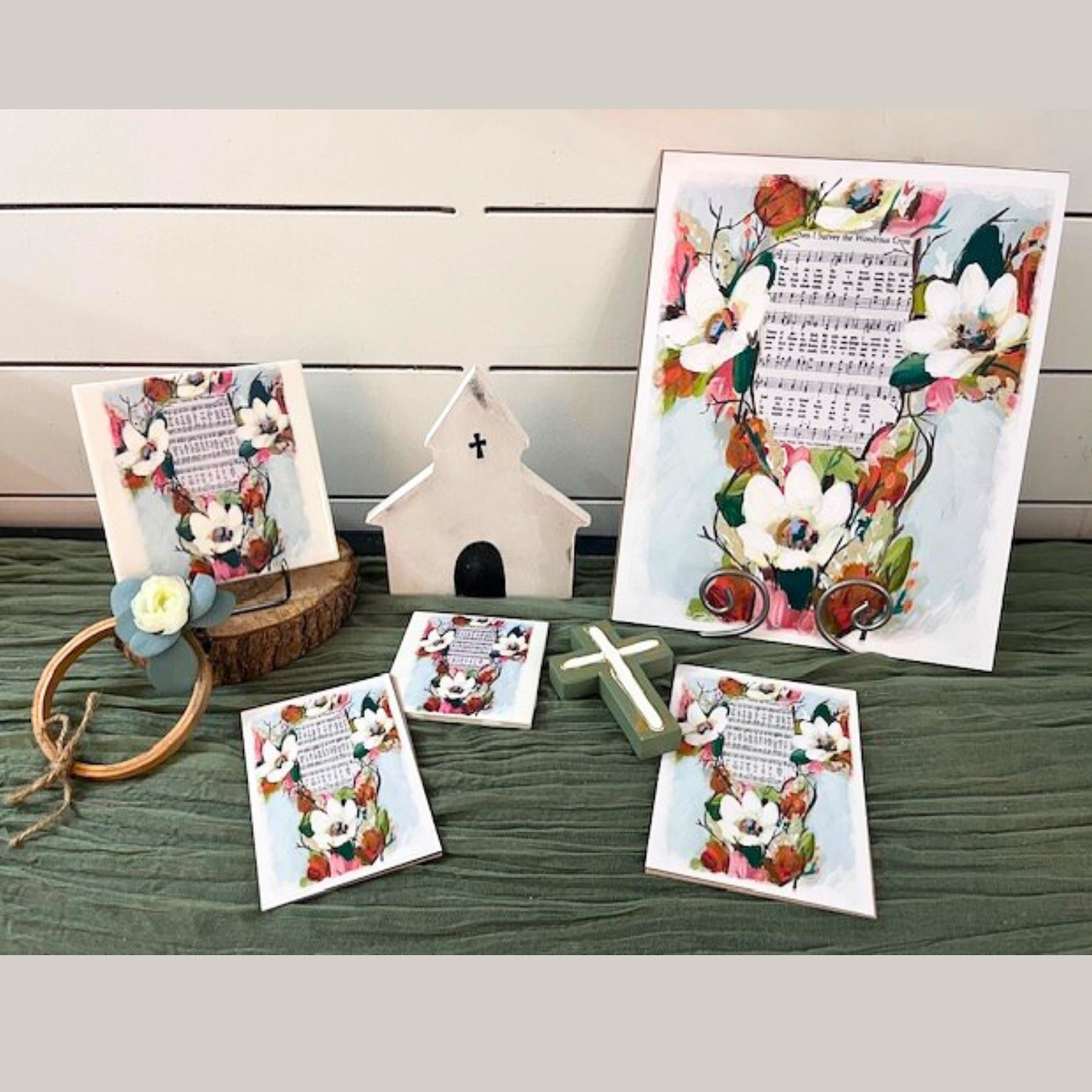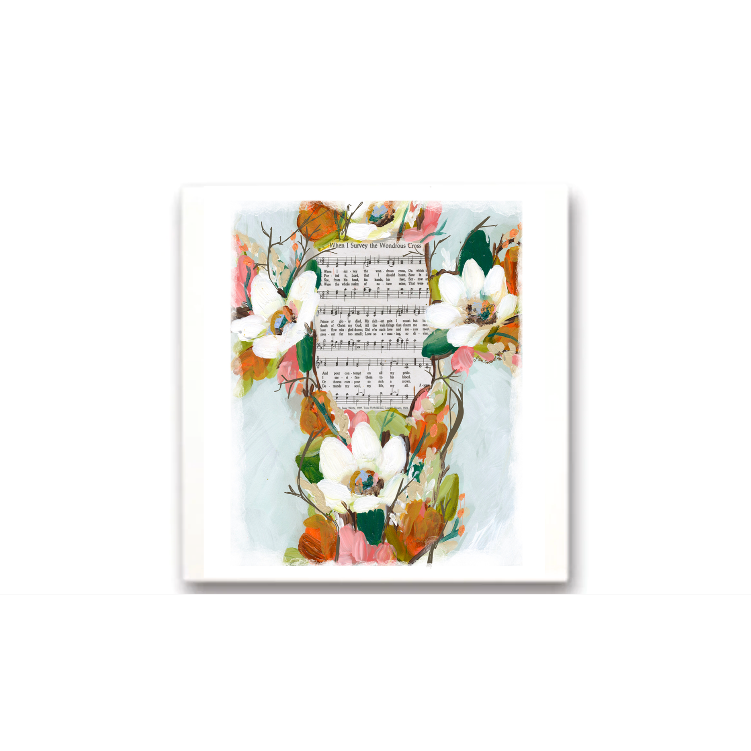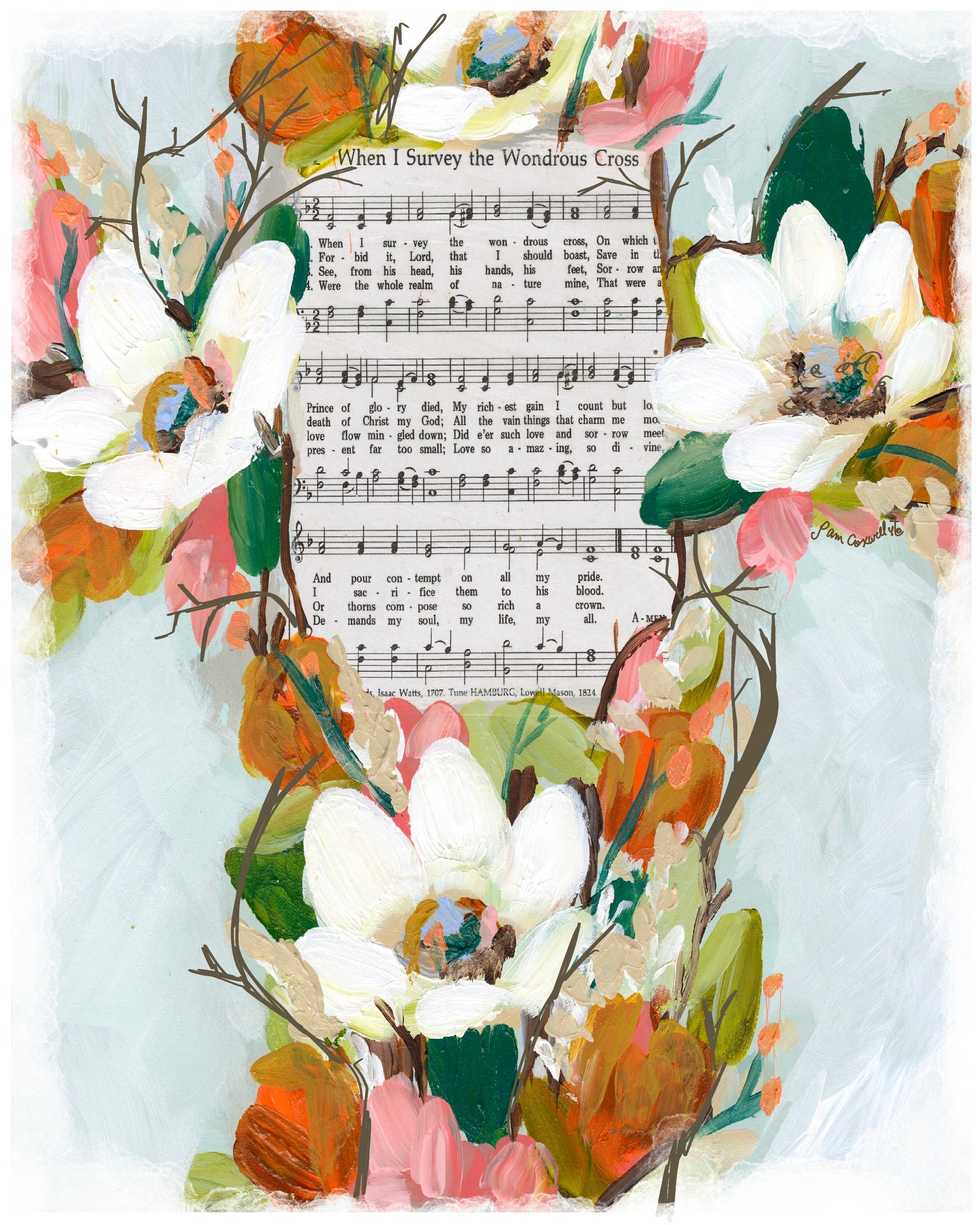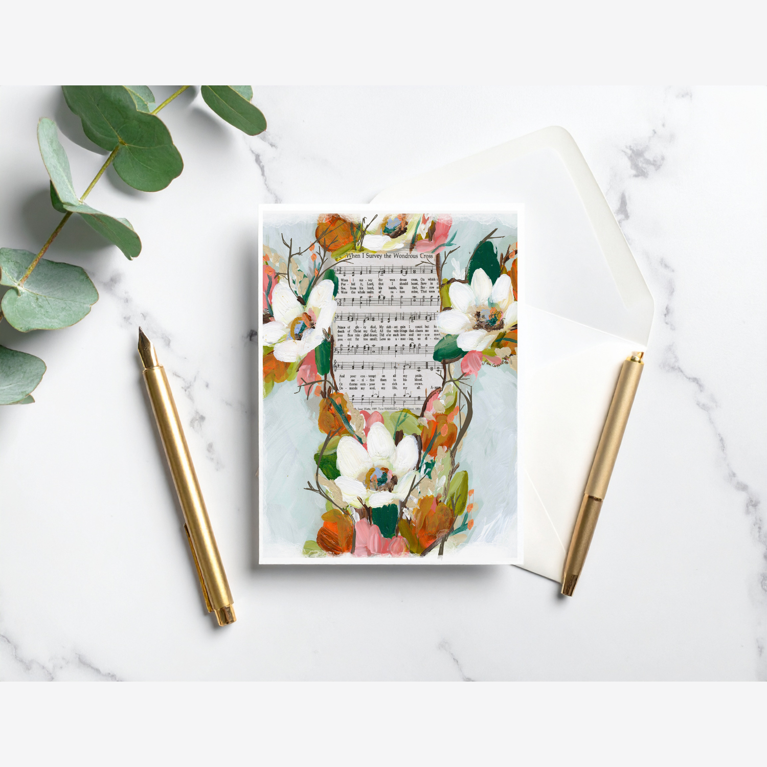 The "When I Survey Cross" design is from the popular hymn, When I Survey The Wondrous Cross. It features sheet music from the song with a beautiful floral cross painted around it.