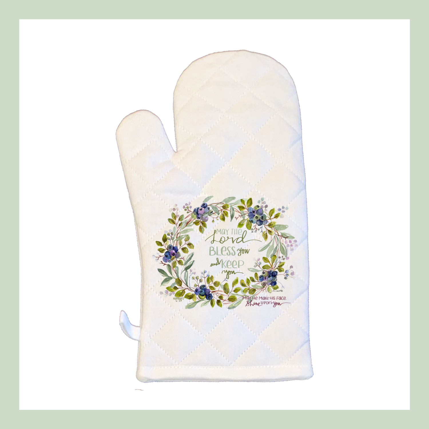 Oven Mitt: The oven mitt is also 100% quilted cotton that measures approximately 12.5" long x 7" wide at the longest parts of the mitt. The mitts have a tag to easily hang somewhere for your convenience.