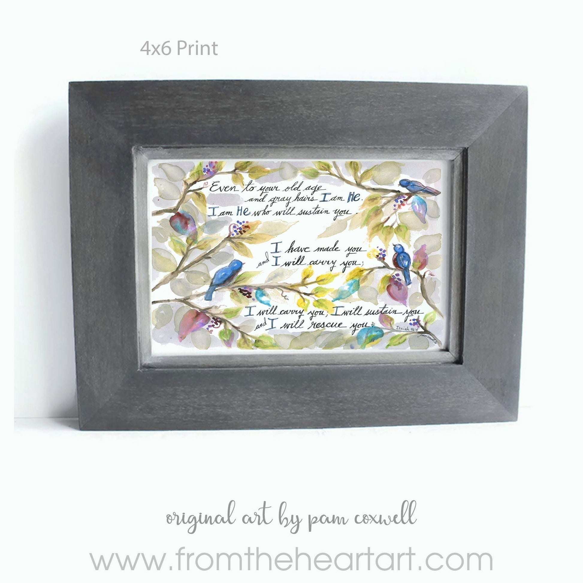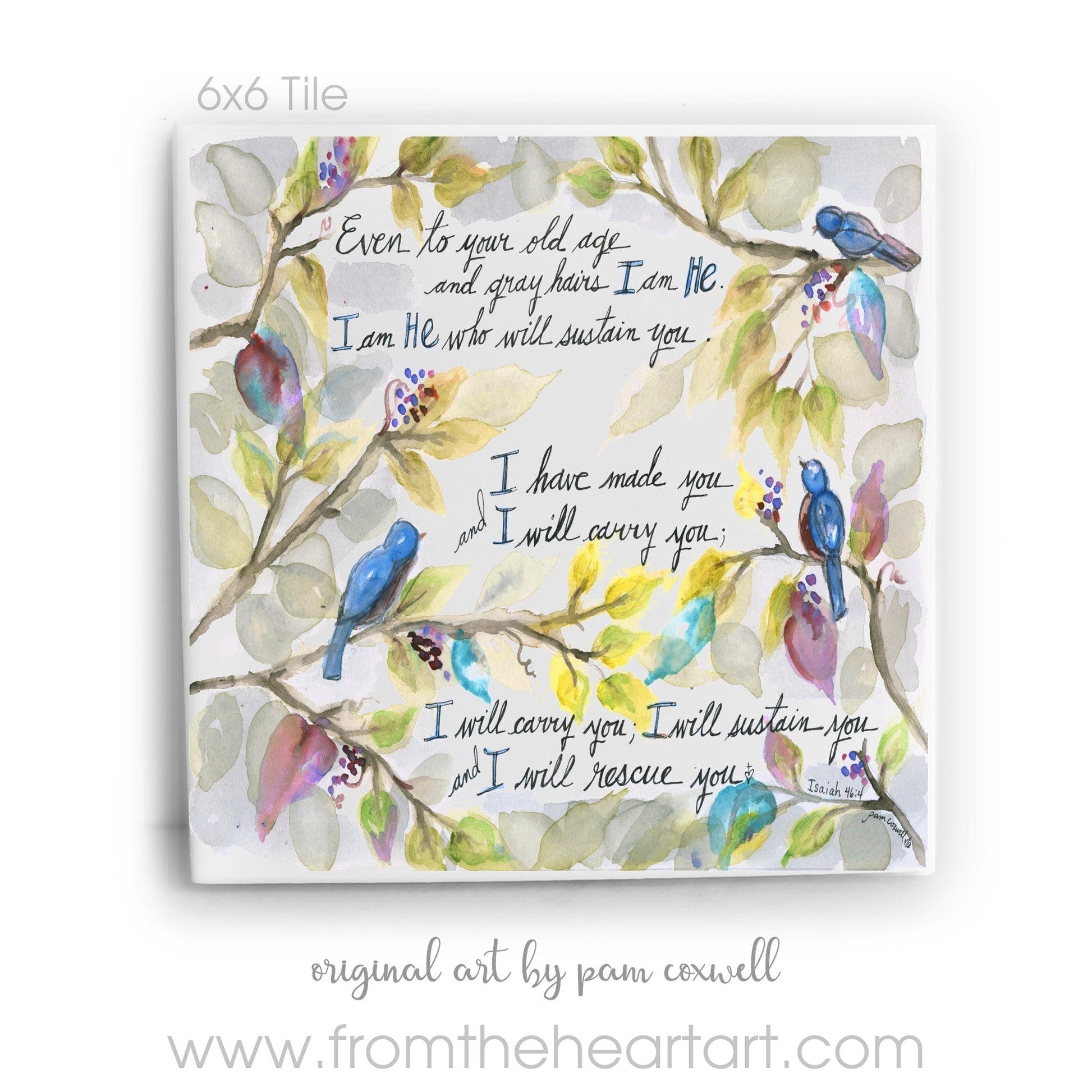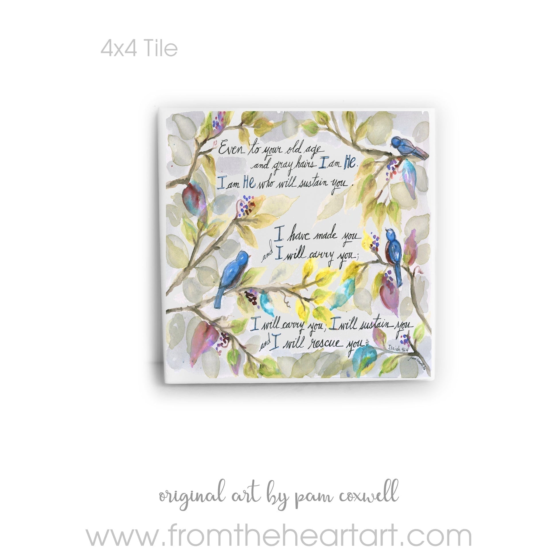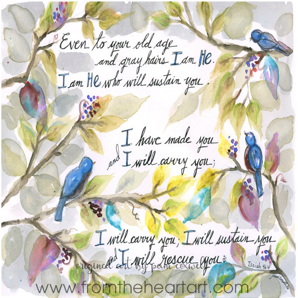 The verse for this design is from Isaiah 46:4, "Even to your old age and to gray hairs I am He. I am He who will sustain you. I have made, and I will carry you; I will carry you; I will sustain you, and I will rescue you."