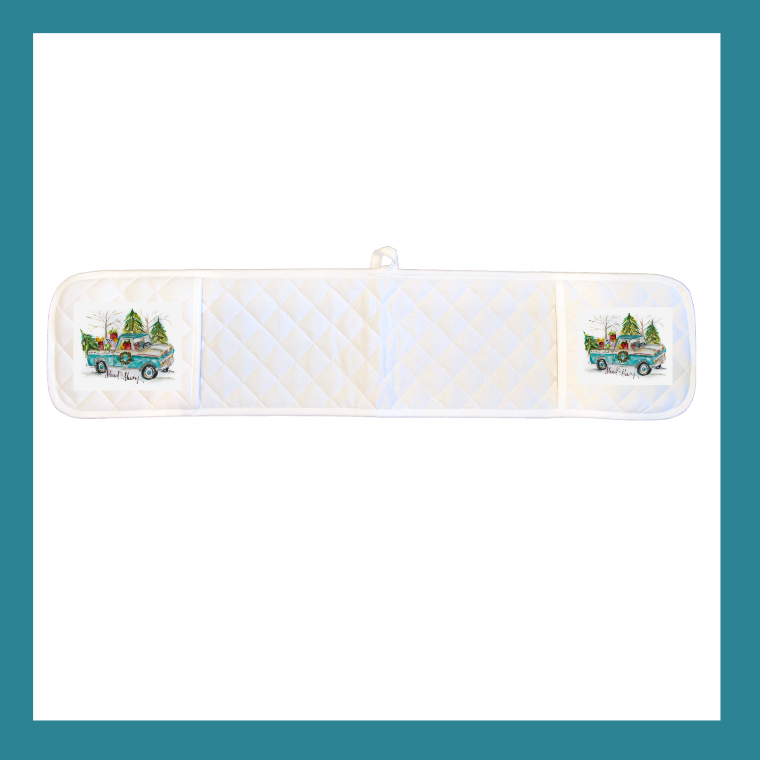 Double Glove Pot Holder: The double pot holder is 35" long! Perfect to wrap around a hot casserole dish. It is 8" wide and has a pot holder glove at each end. 100% quilted cotton.