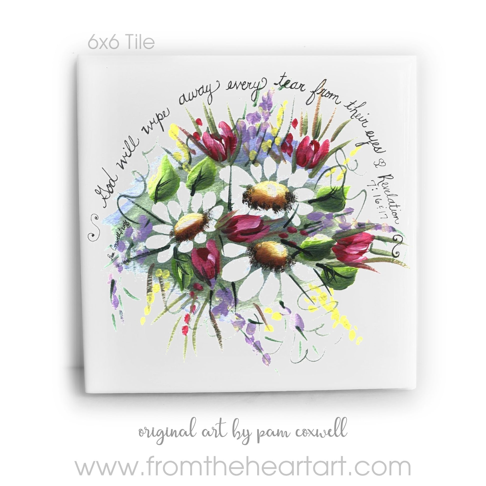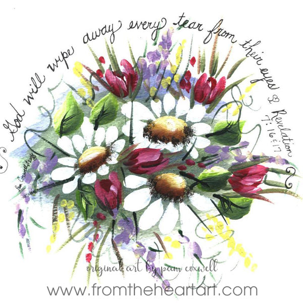 The verse for this design is from Revelation 7:16 & 17, "God will wipe away every tear from their eyes."