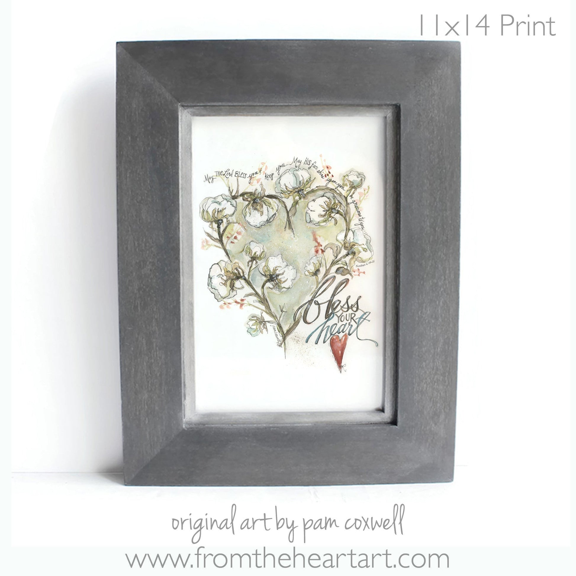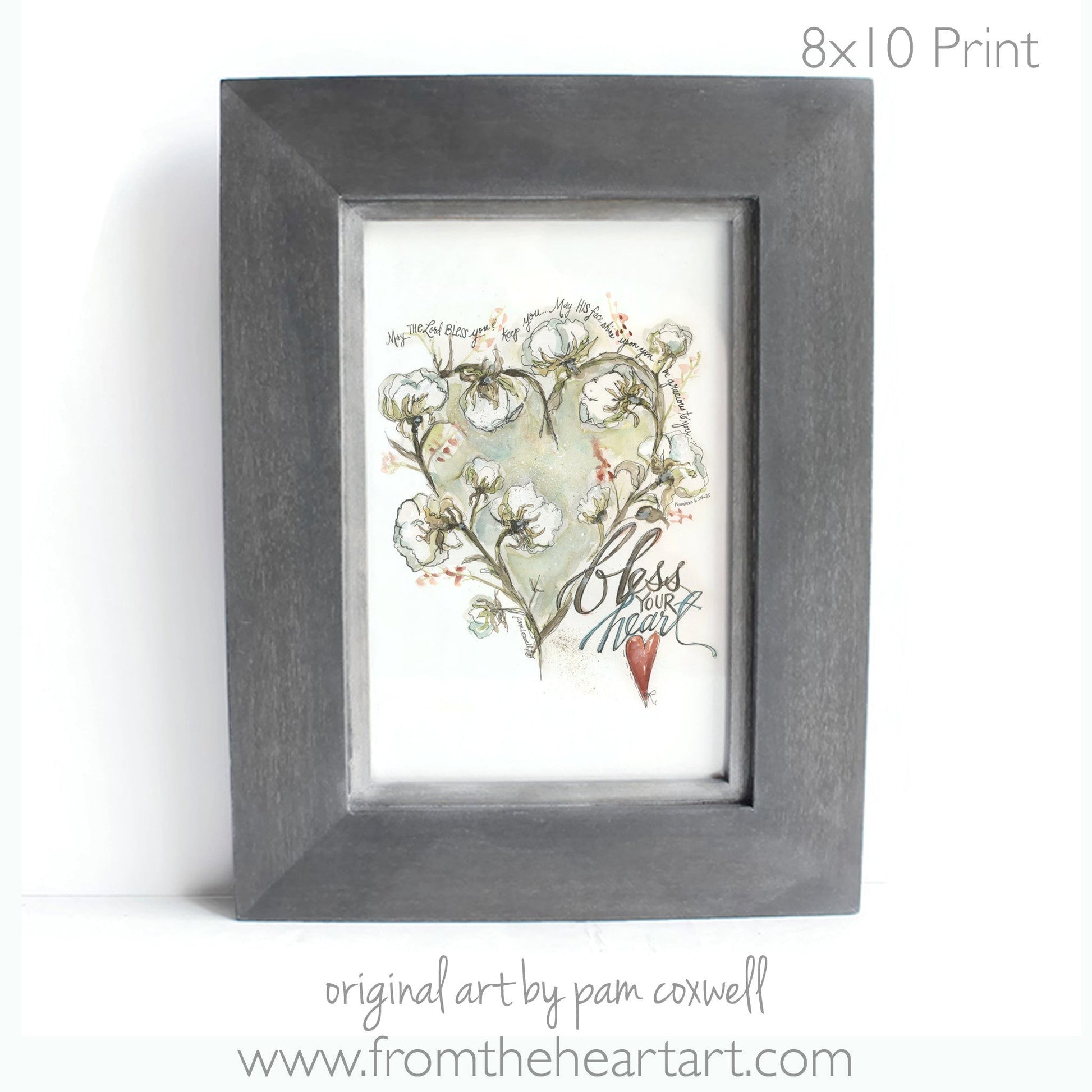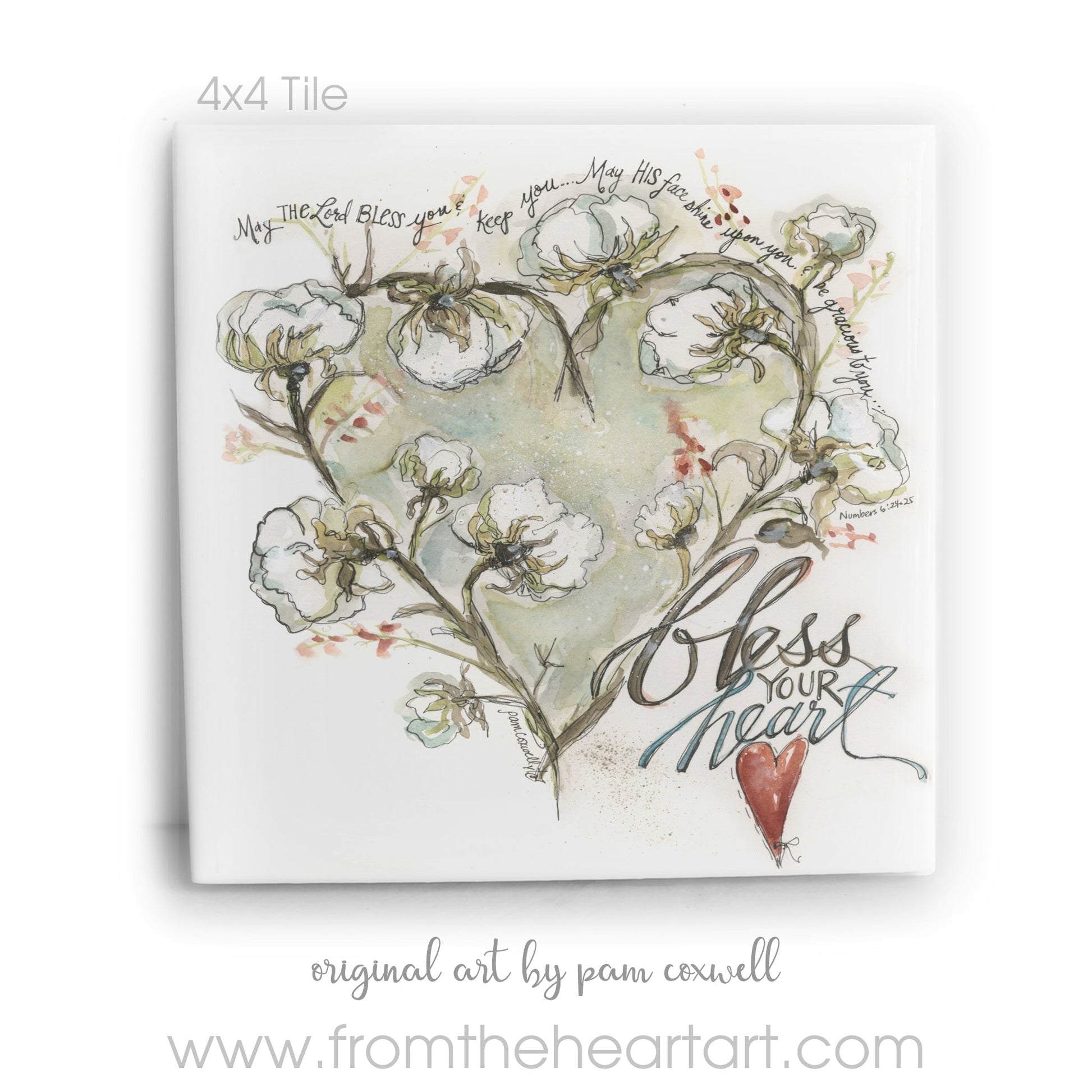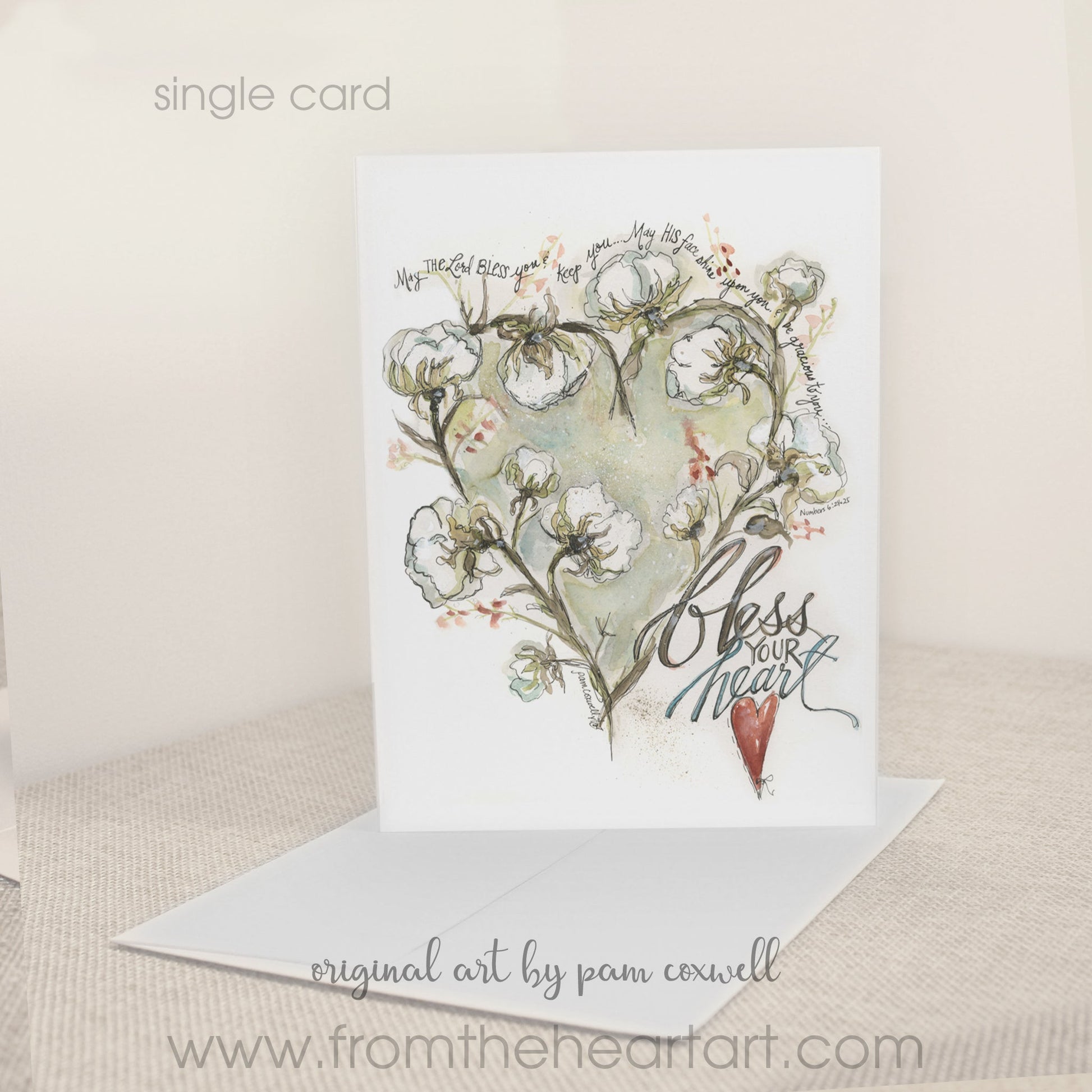 The "Cotton Heart" is an original design painted by Pam Coxwell featuring the epitome of Southern sayings "Bless your heart."