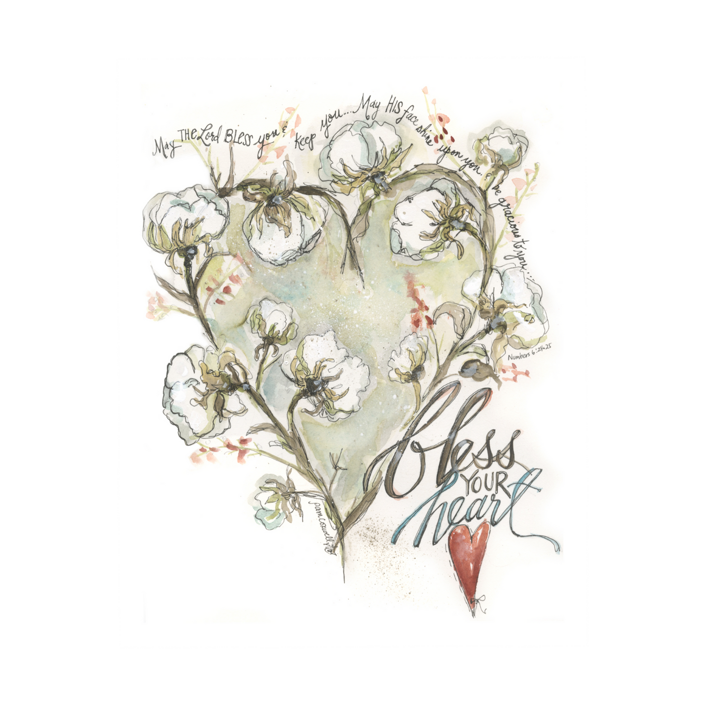 The "Cotton Heart" is an original design painted by Pam Coxwell featuring the epitome of Southern sayings "Bless your heart."