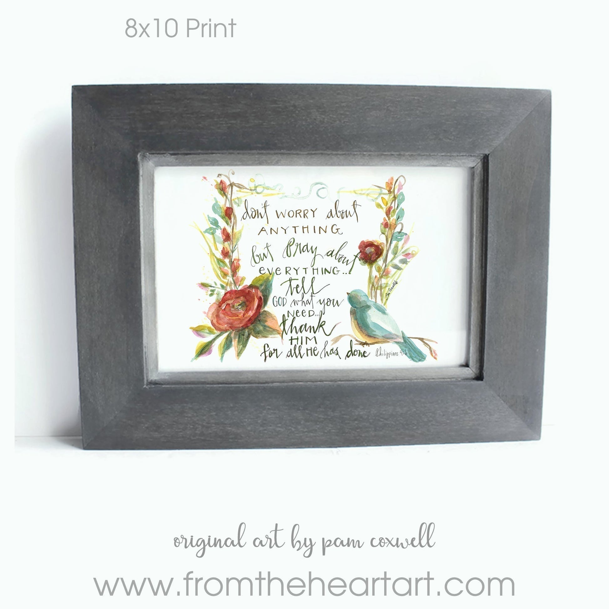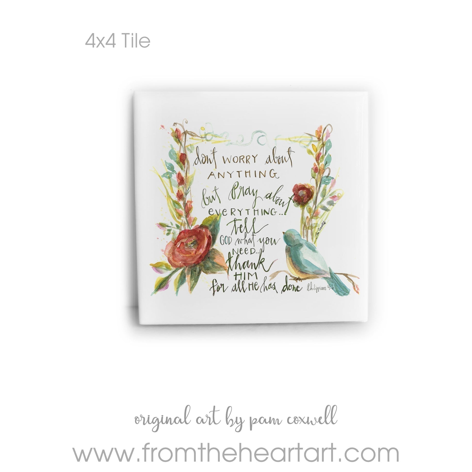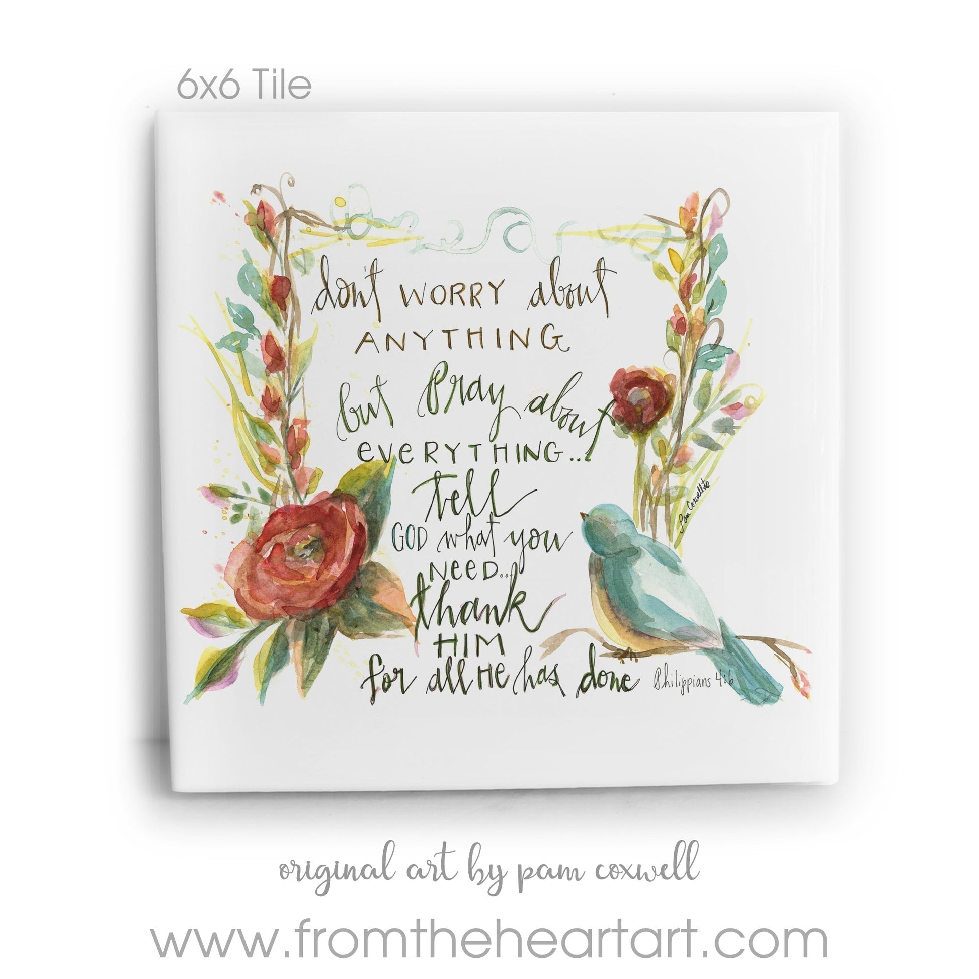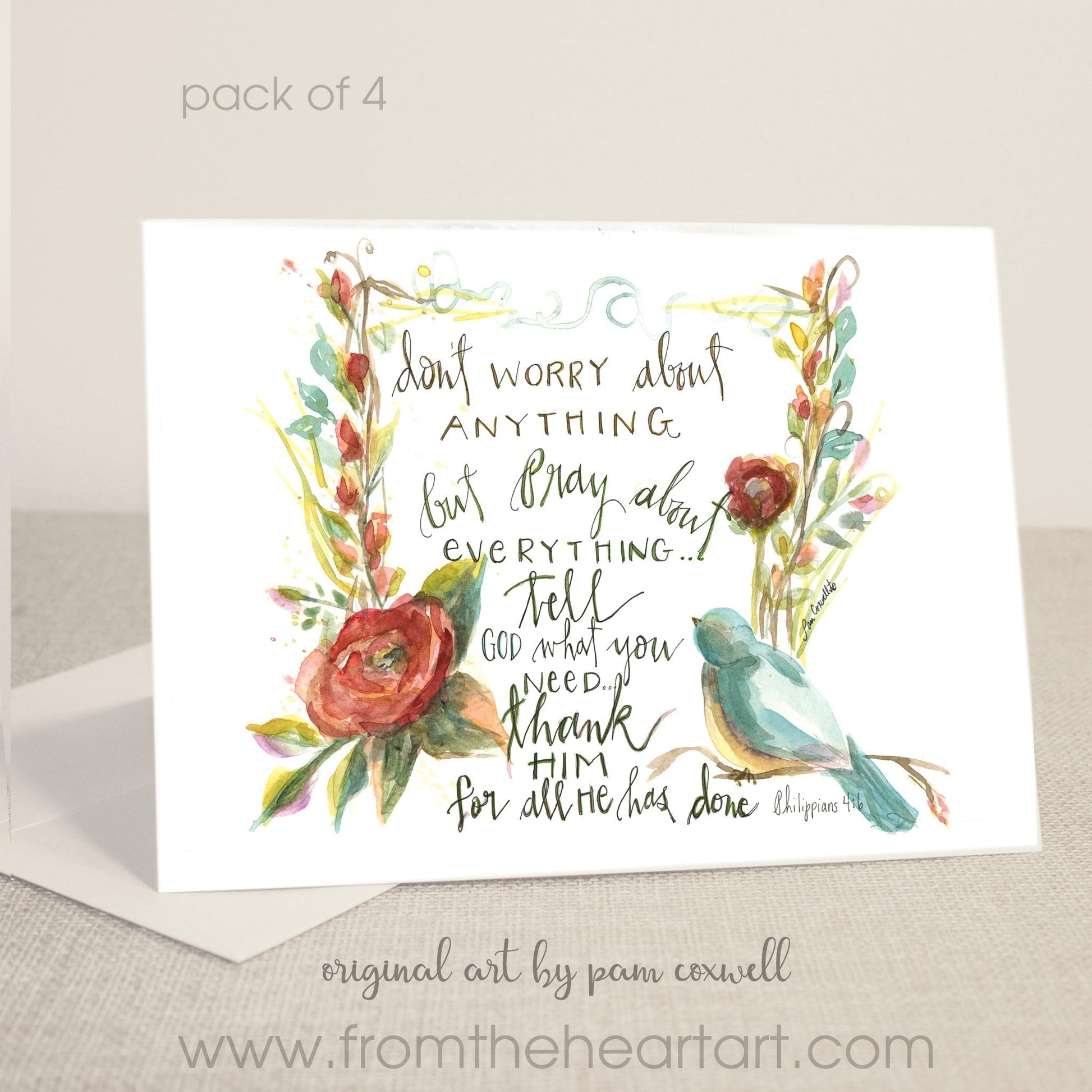 This design features the verse Philippians 4:6, "Don't worry about anything, but pray about everything... tell God what you need... thank Him for all He has done."