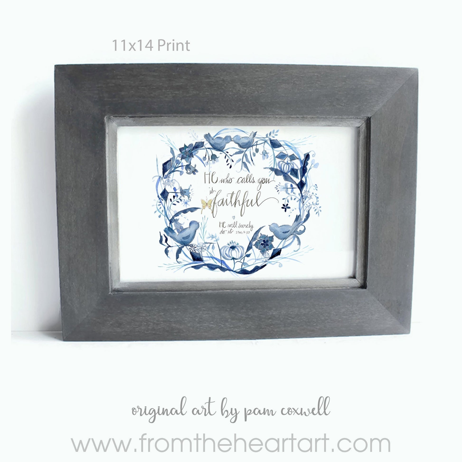 This design features scripture from 1st Thessalonians 5:23, "He who calls you is faithful. He will surely do it."