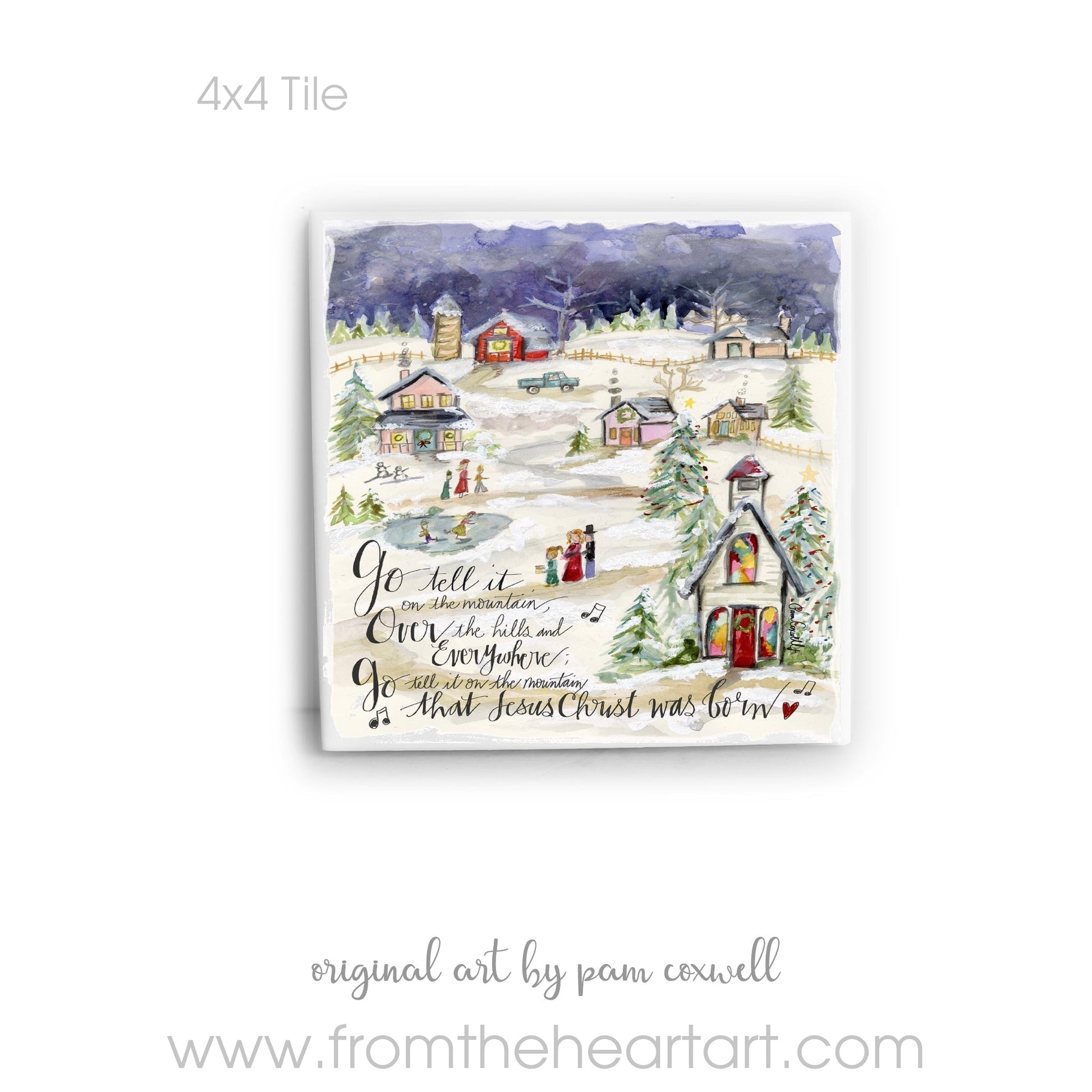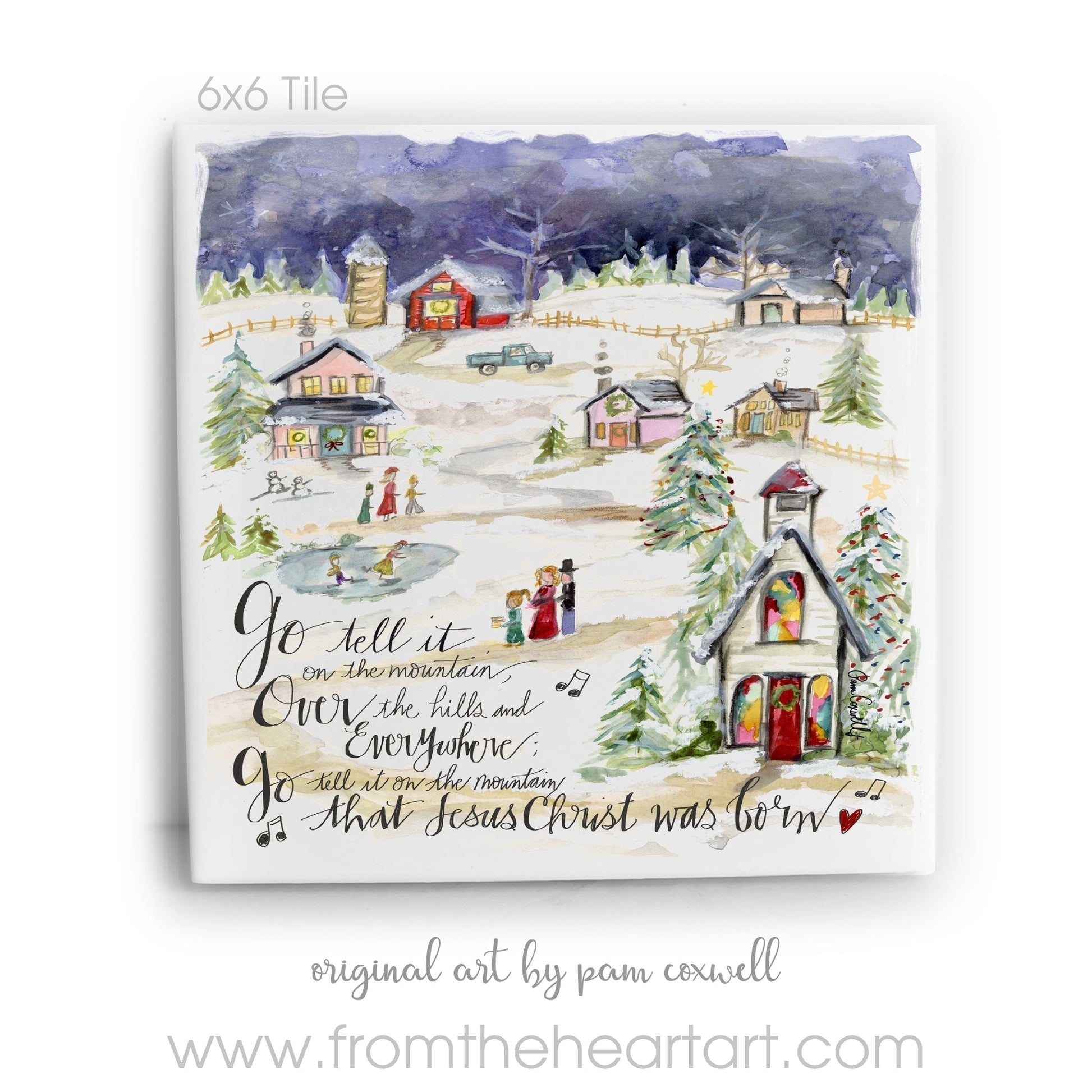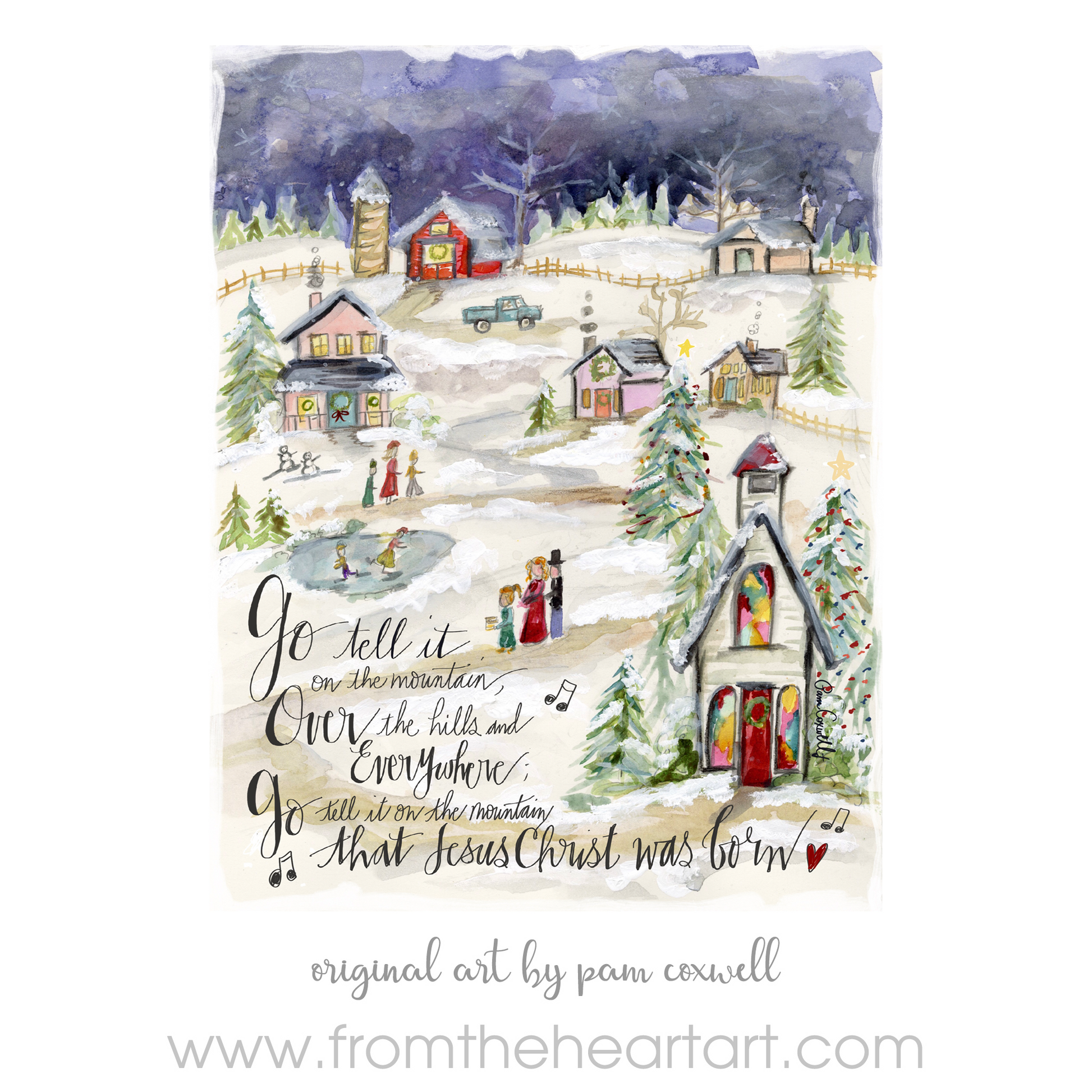 The "Go Tell it on the Mountain" is an original design painted by Pam Coxwell based on the hymn of the same name.
