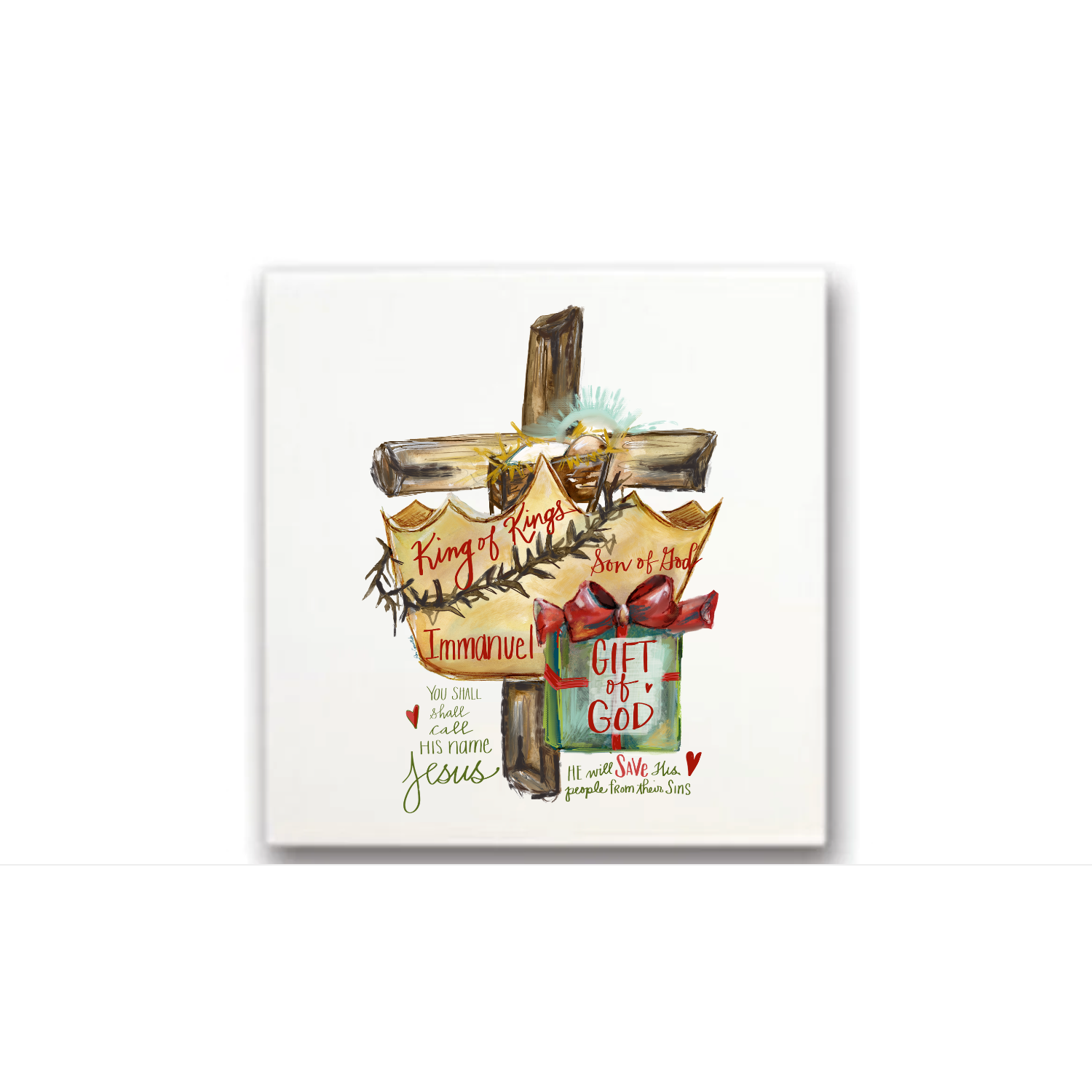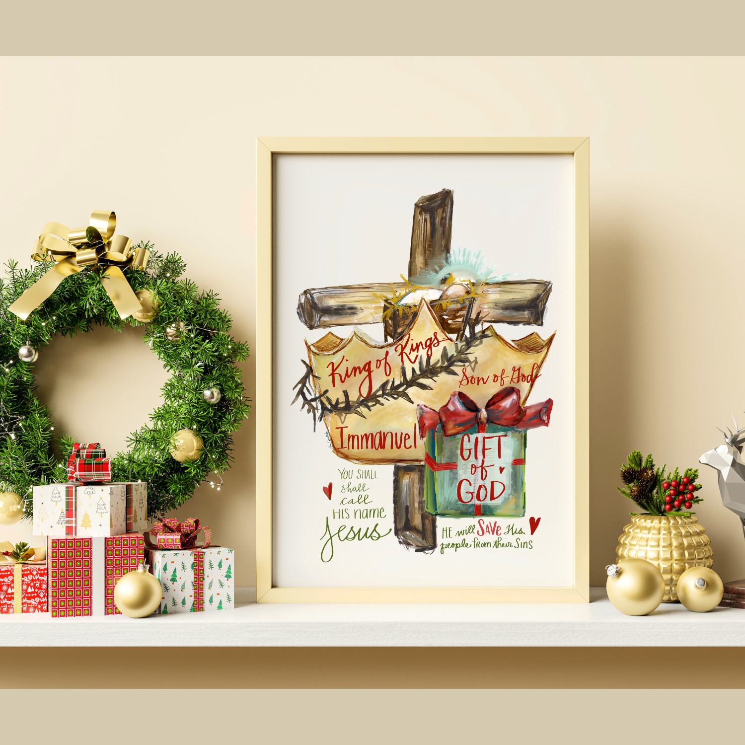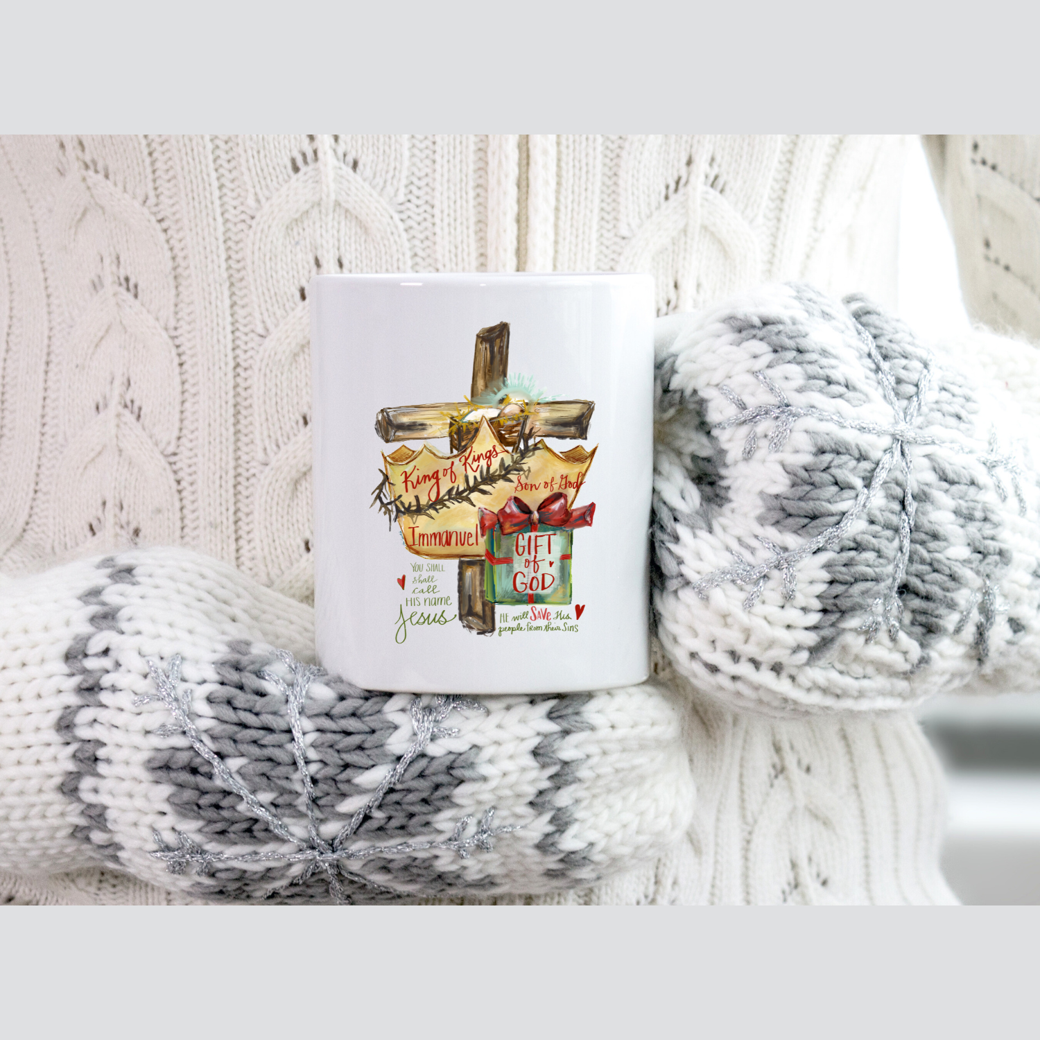 Our newest Christmas design features a beautiful collage of the cross, the crown, the crown of thorns, a present and a baby in a crib with the names of Jesus on one side. And on the other side, words from the scripture Matthew 1:21, "You shall call His name Jesus and He will save His people from their sins."
