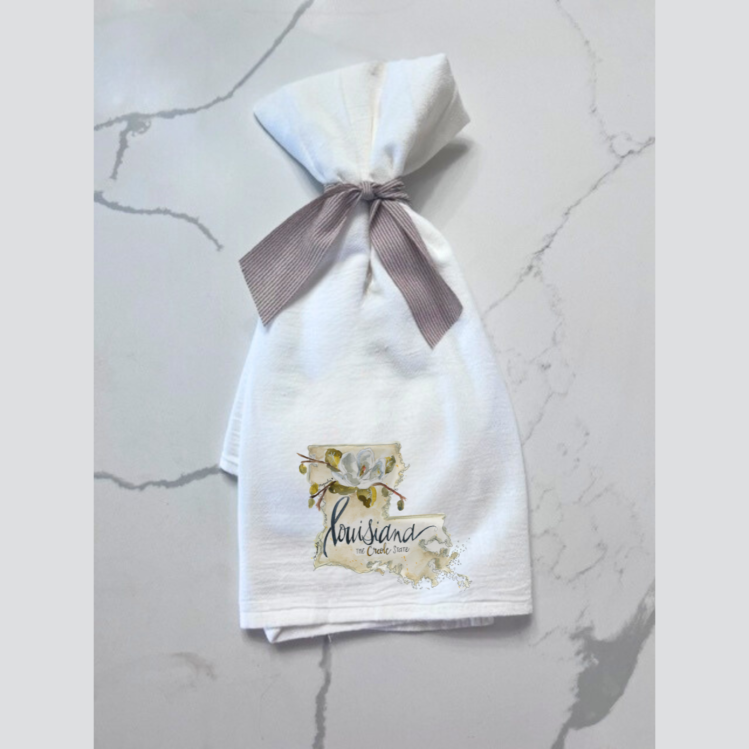 Flour Sack Towels: This 28 x 29-inch flour sack towel is soft-white, 100% cotton, made in the USA from Indian fabric. It is a soft, low-lint, hemmed, medium weight towel. The towel will come tied with a color-coordinating ribbon.
