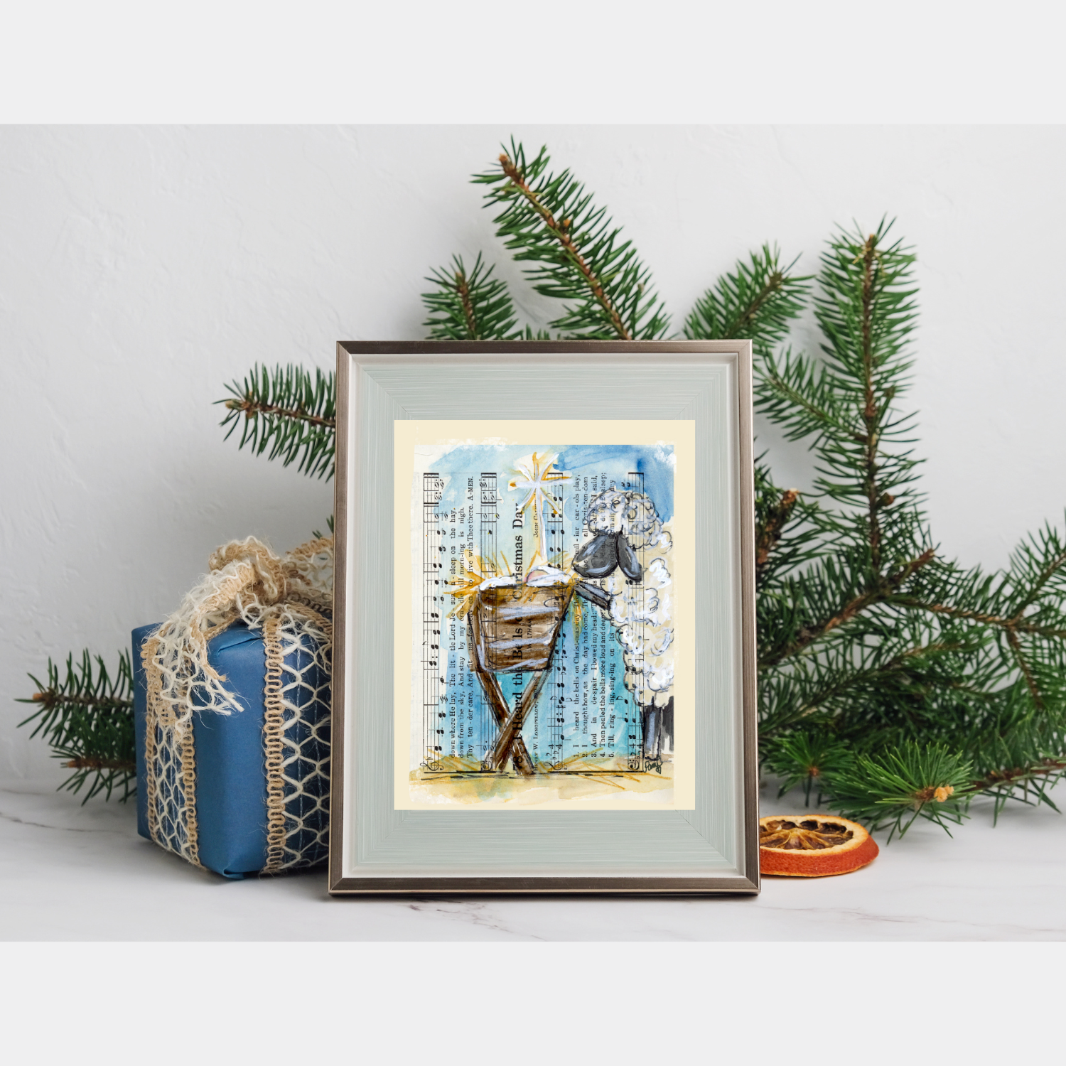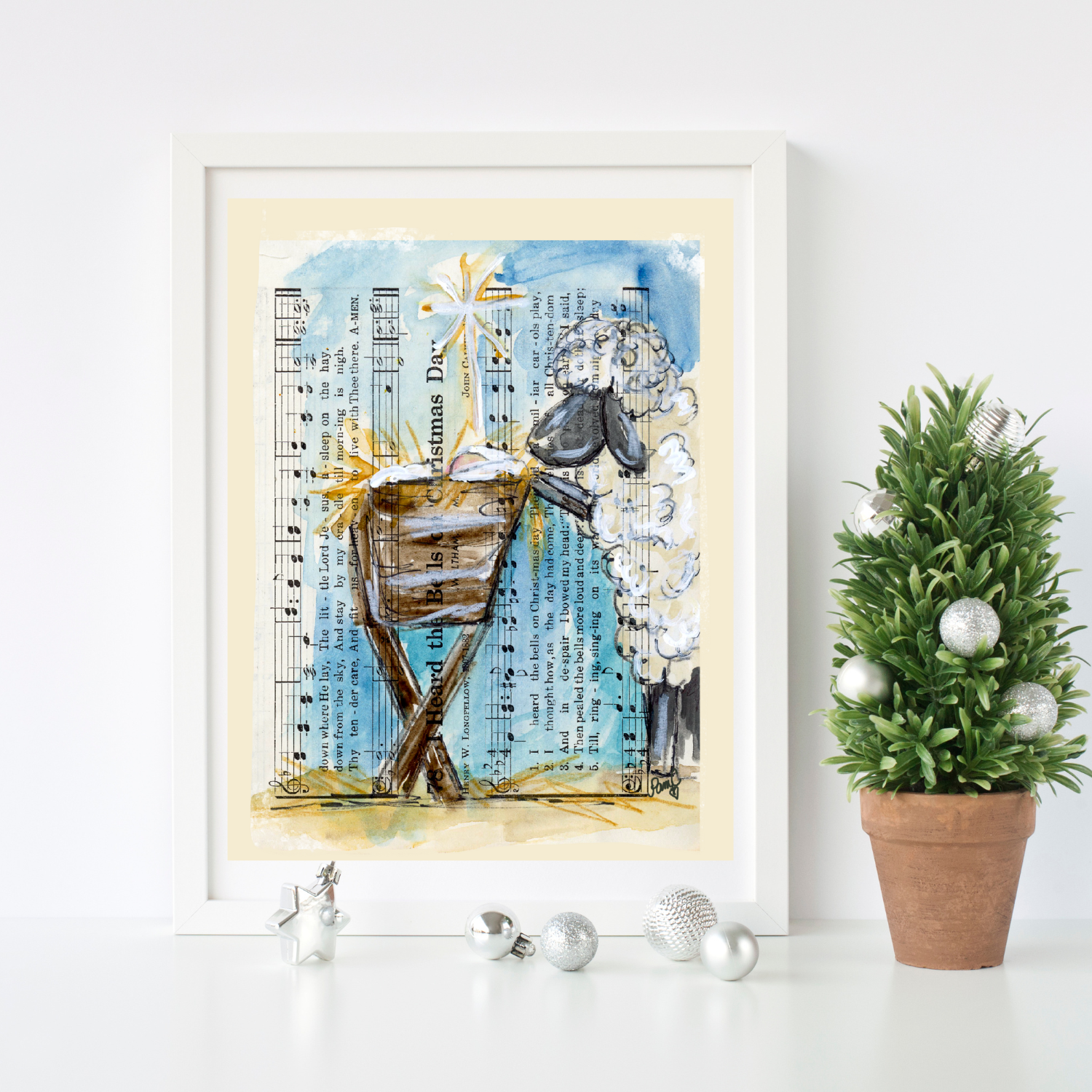 The "Nativity Sheep" features a sheep looking over baby Jesus in a crib with a unique sheet music background.