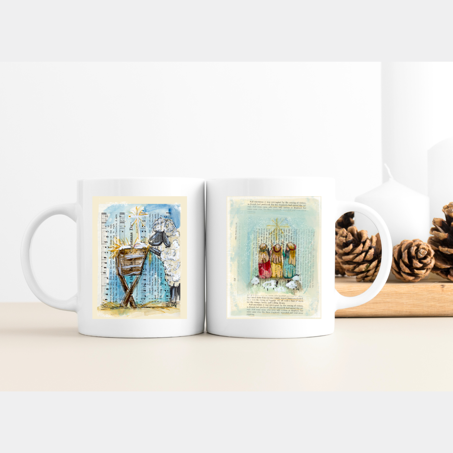 Ceramic Mugs: This mug features both of our NEW Nativity designs, Nativity Sheep and Nativity Shepherds. Each mug is pressed in our studio and packaged in a gift box. The mugs are 11 oz.
