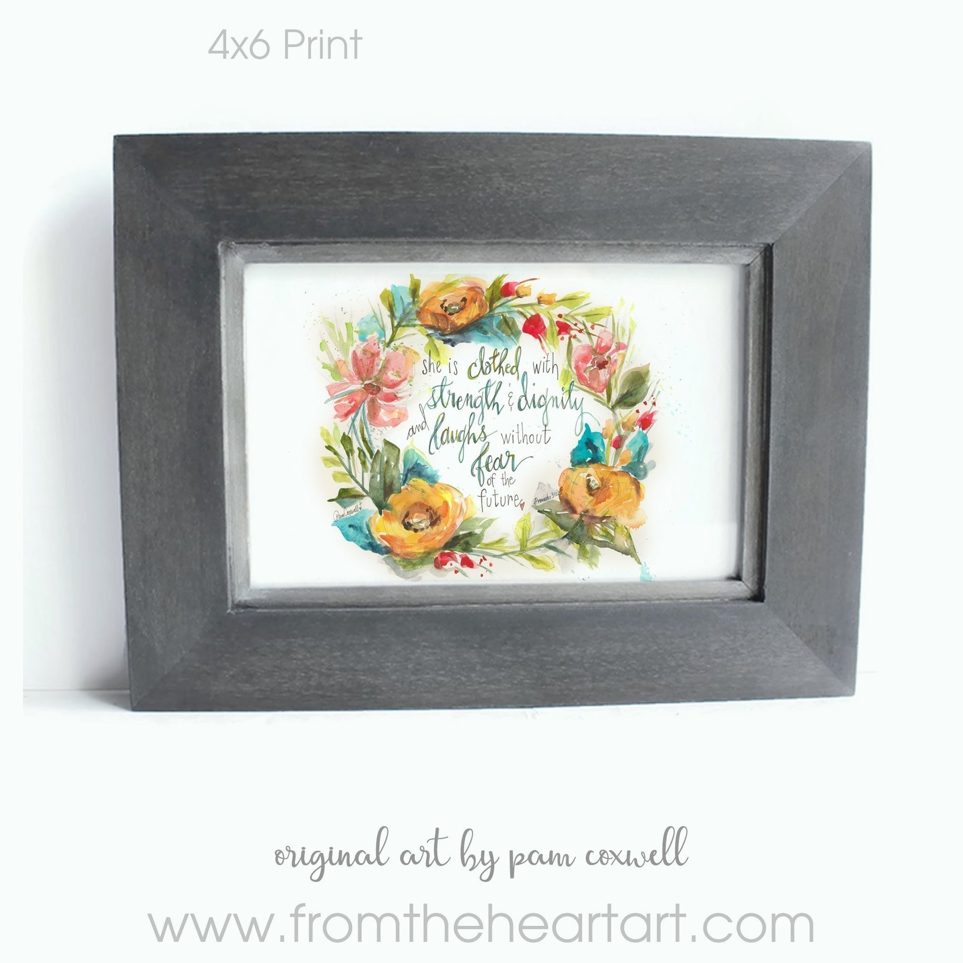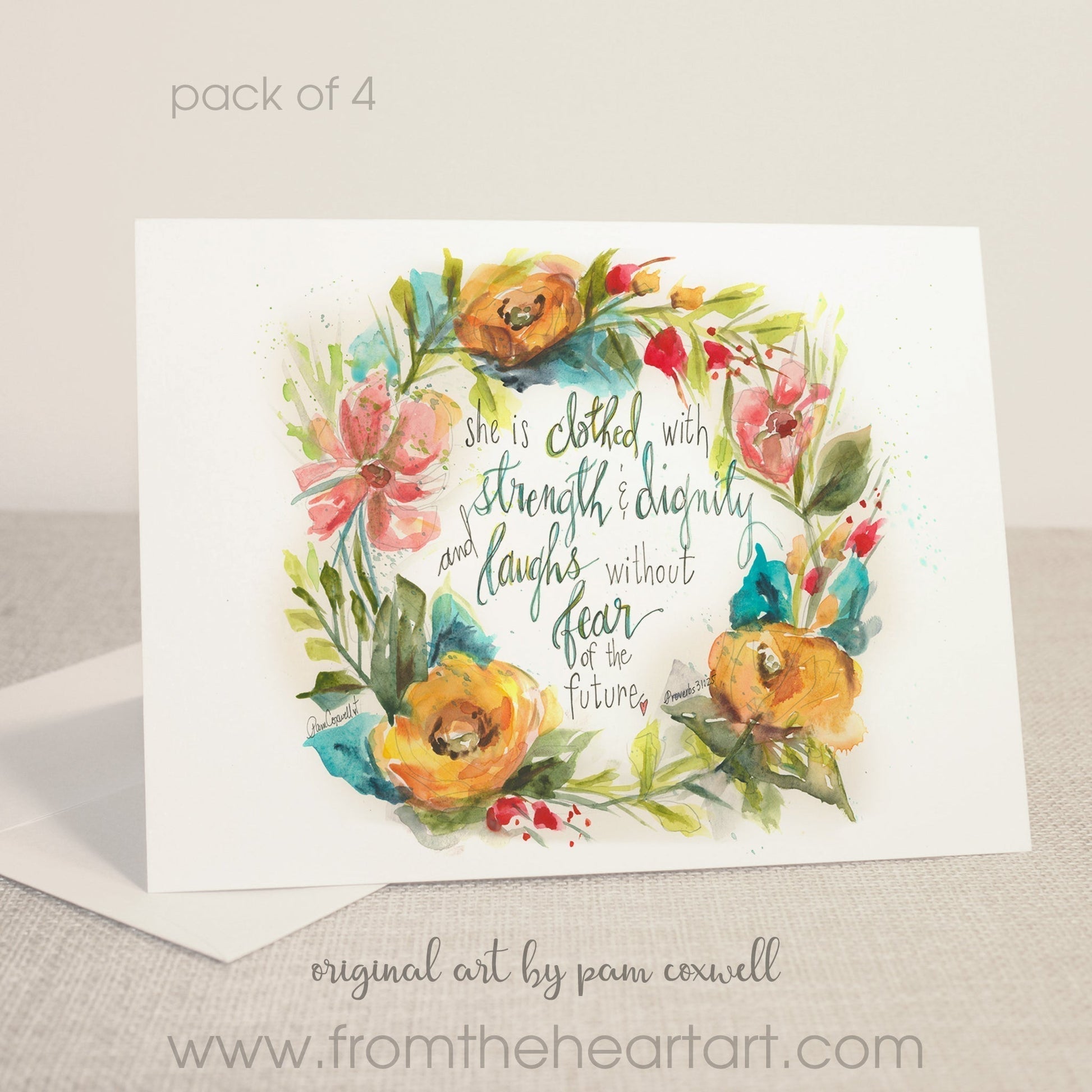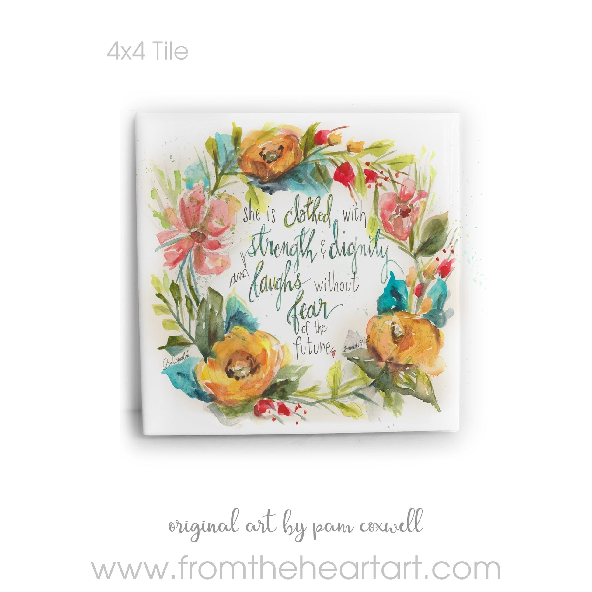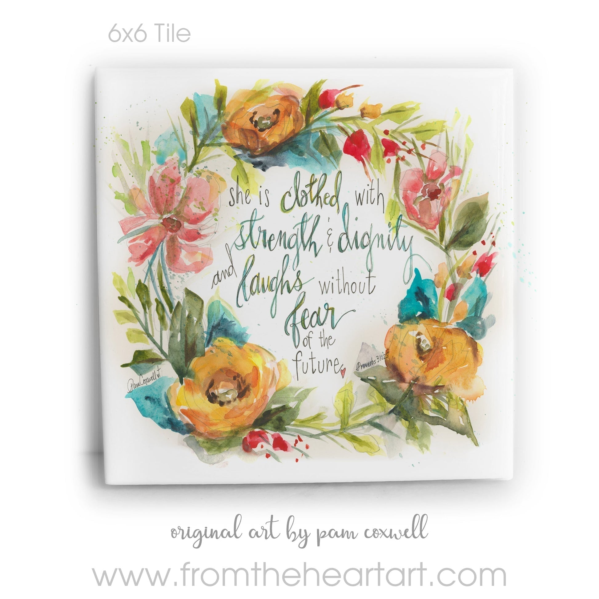 The verse for this design is from Proverbs 31:25, "She is clothed with strength and dignity and laughs without fear of the future."