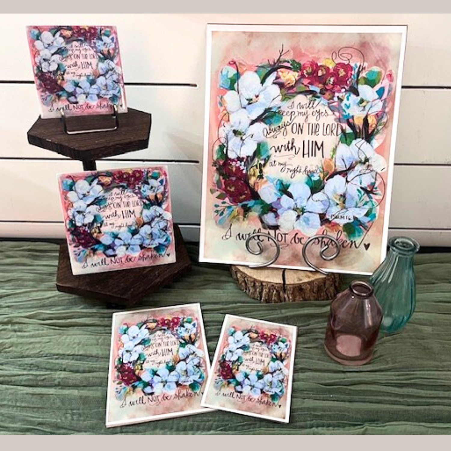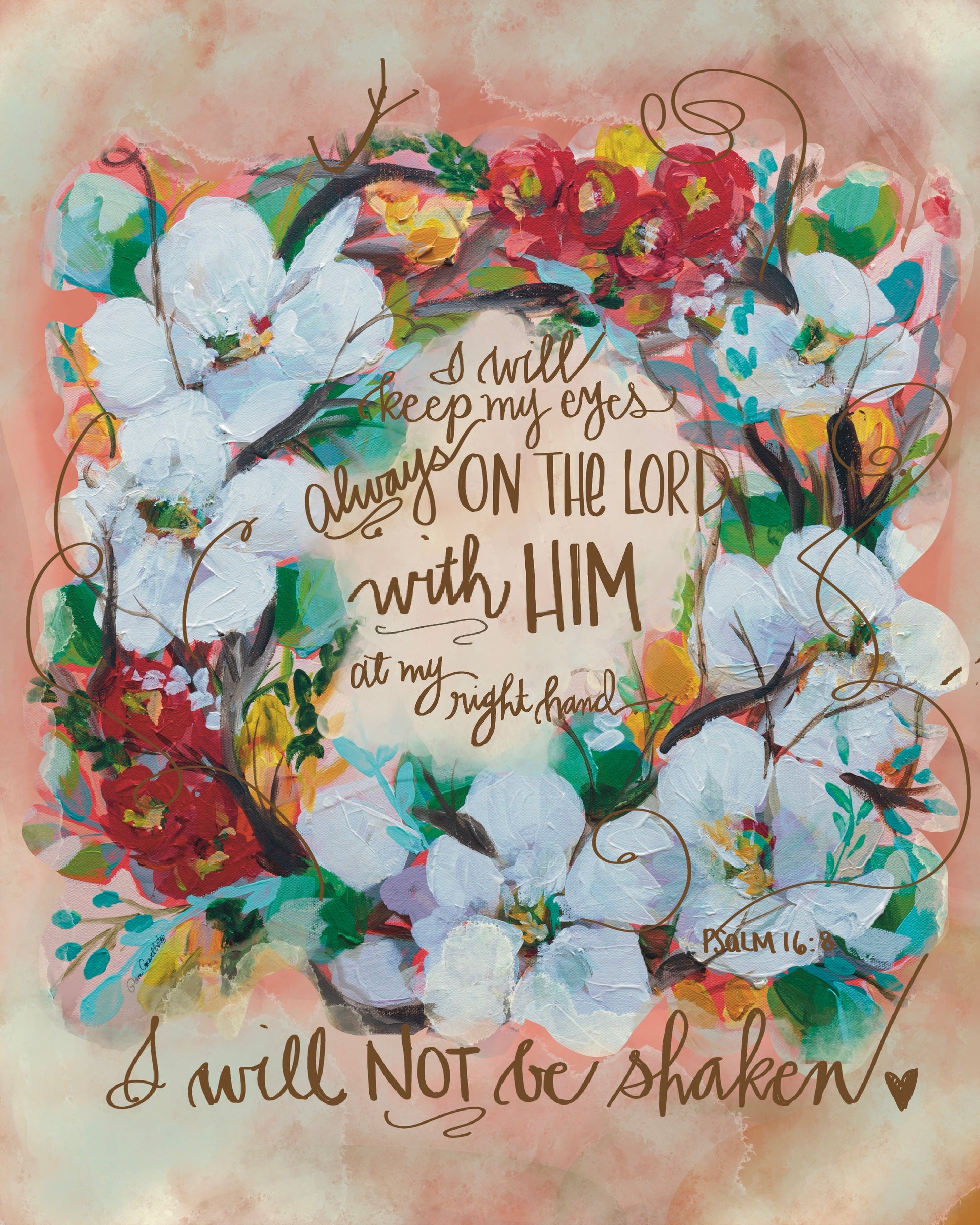 The "Will Not Be Shaken Wreath" design is from the scripture Psalm 16:8, which says "I will keep my eyes always on the Lord with Him at my right hand... I will not be shaken."