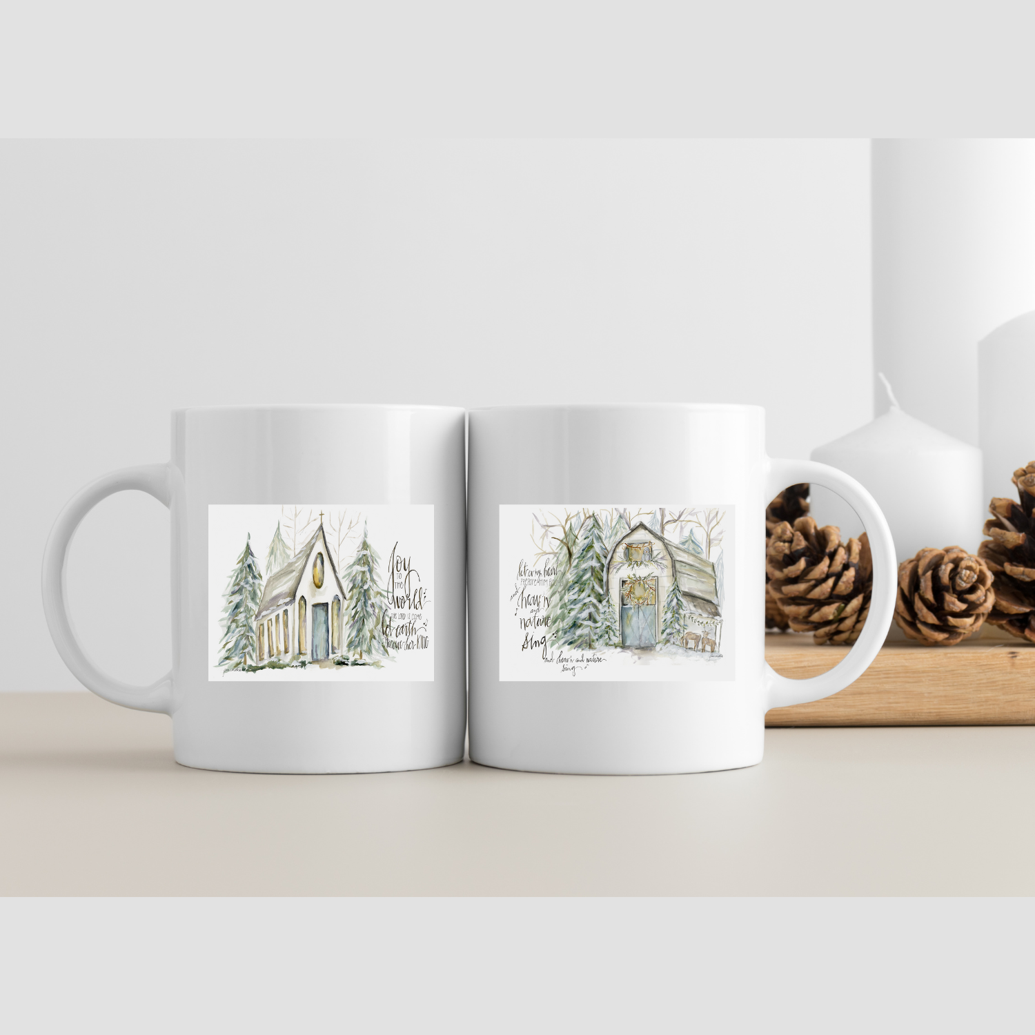 ** Check out our Winter Cove mug! This 11-ounce white ceramic mug features the Winter Cove Barn on one side and the Winter Cover Chapel on the other side!